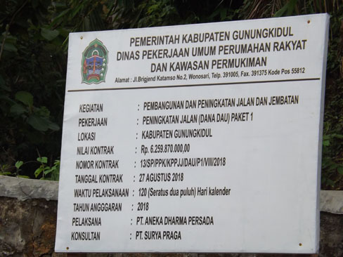 Pasalnya jalannya telah di perkeras dengan cor beton yang menelan biaya dana besar dari DAU Pemkab Gunungkidul senilai sekitar 6.259.870, 00 (Enam milyar lebih )