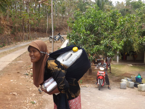 Terpantau warga berduyun duyun mengantri air dengan alat deligen dengan cara di gendong dan memikulnya hingga ke rumahnya masing masing. Lokasi ini setiap musim kemarau langganan kekeringan.