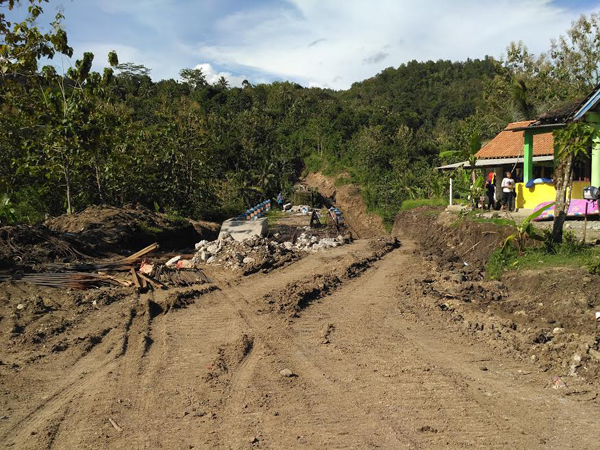 Untuk mempercepat pekerjaan, PT. Aneka Dharma Persada sebagai pemenang lelang mengerahkan beberapa becko guna pemapras gunung, menguruk tebing yang curam dan meratakan tanah yang akan dibuat jalan, mengingat wilayah tersebut merupakan pengunungan, tebing yang tinggi serta curam.