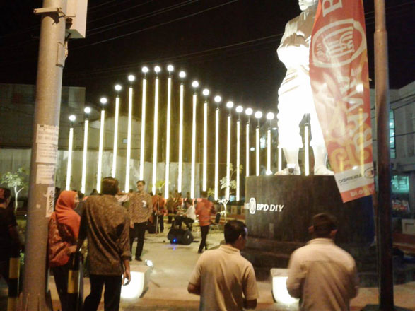 Patung tersebut dilengkapi dengan sejumlah asesoris diantaranya beberapa lampu serta tempat duduk diresmikan oleh Bupati Kabupaten ini Drs H Suharsono dan Direktur Utama BPD D I Yogyakarta Santoso Rohmat, Jumat (14/12) malam.
