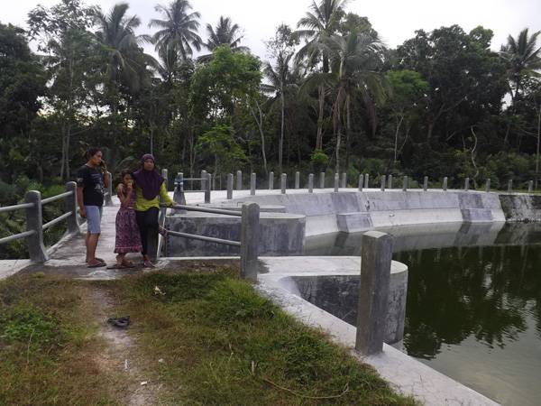 Terpantau embung ini airnya pada bulan agustus tidak kering sehingga di dalamnya terdapat ikan ikan yang memang di taburi oleh para pengurusnya.