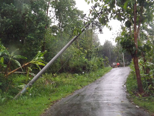Satu tiang listrik nyaris roboh dan kabel terburai ke tanah. Kejadian ini akibat hujan besar dan pohon sengon menimpa kabel berakibat tiang listrik roboh 90 persen dan menghambat pengguna jalan.