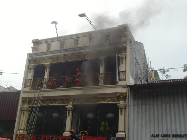 Penyelamatan Dinas Damkar Kota Yogyakarta Mahargyo. Untuk sementara dugaan kasus terbakarnya toko tersebut disebabkan arus pendek listrik yang berasal dari lantai tiga.