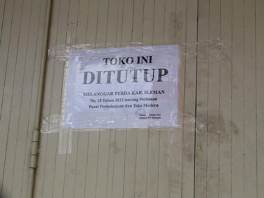 Ketiga, swalayan berjejaring nasional tersebut, sebagaimana diungkapkan, Bupati Sleman Sri Purnomo, ditemui seusai membuka Musda IX Partai Golkar,Kabupaten Sleman menyatakan pihaknya akan bersikap tegas jika diketahui swalayan yang tidak berizin akan menutup paksa.