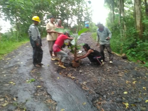 Saat jalan rusak 21 april 2018 warga tanani jalan dengan pohon pisang