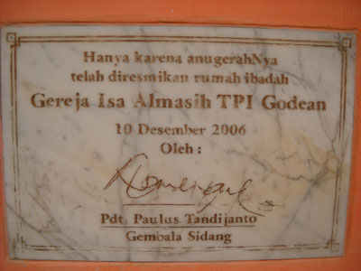 Tempat ibadah gereja yang berada di tengah perkampungan ini bila ditelusuri keberadaannya tidak ditempat yang sesuai dengan nama yang ada di plakatnya tertulis Godean, padalahal geraja ini terletak di Ngentak Margo Luwih Seyegan Sleman.