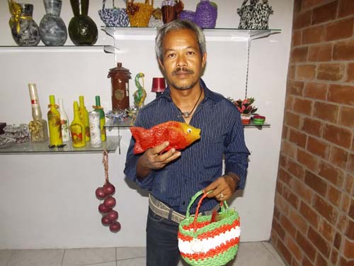 BUDI MENUNJUKAN TAS KAIN DAN IKAN DARI BAHAN SAMPAH PLASTIK BOTOL AQUA