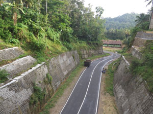Jalan yang berkelok di sepanjang penjalanan di apit hutan, sedang ketika malam sangatlah sepi, sehingga suasana tampak menyeramkan karena hutan lebat akan menjadi teman sepanjang 20 km.