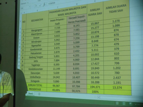 Menurutnya, paslon Haryadi Suyutiunggul di tujuhdari 14 kecamatan, yakni di Kecamatan , Mergangsan,Mantrijeron,Keraton, Wirobrajan, Ngampilan,Umbulharjo dan Kotagede.