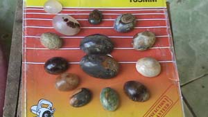 Pria 30 tahun tersebut menunjukan batu batu hasil dari polesannya, seperti dari calsedon,kecubung, teratai, dan lain lain terlihat di pajang di kamarnya.
