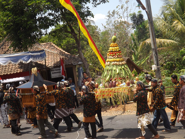 Usai kirab hasil bumi selanjutnya di arak keliling desa dan menjadi rebutan, sedang gunungan yang isinya buah-buahan sayuran dari hasil bumi terlihat meriah dan ramai, di akhir acara di laukan doa dan kenduri bersama-sama serta pembagian nasi lauk –pauk yang di tempati nasi sarang/merupakan anyaman dari daun kelapa.